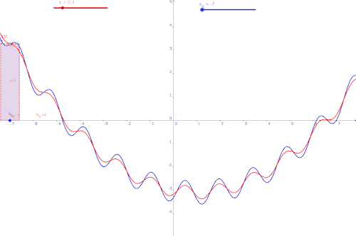 Wenn wir eine kontinuierliche Messung von Werten betrachten, z.B. eine Kraft zur Zeit . Ziel ist es, die Werte mit einem kontinuierlich aggregierten gleitendem Mittelwert zu glätten. Wir sehen eine Zeitspanne von in der Vergangenheit. Als Wahrscheinlichkeitsverteilung verwenden wir eine gleichmäßige Verteilung (Mathematik)] für den Zeitraum . Die Dichtefunktion ist: