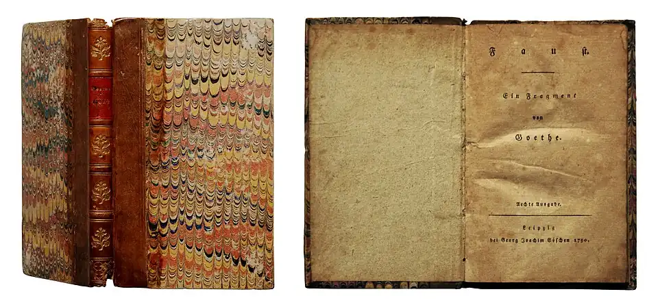 Goethe, J. W.: Faust. Ein Fragment. Aechte Ausgabe. Leipzig: G. J. Göschen 1790, 168 S. Erstdruck mit den Zeilenwiederholungen S. 144/145. Halbleder d. Zt., Kapitale beschädigt.