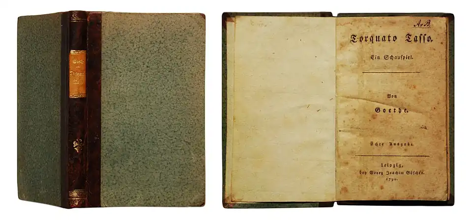 Goethe, J. W.: Torquato Tasso. Ein Schauspiel. Ächte Ausgabe. Leipzig: G. J. Göschen 1790, 222 S., Erstdruck. Halbleder d. Zt. mit Rückenschild, Seiten gebräunt.weiterÜbersichtzurück