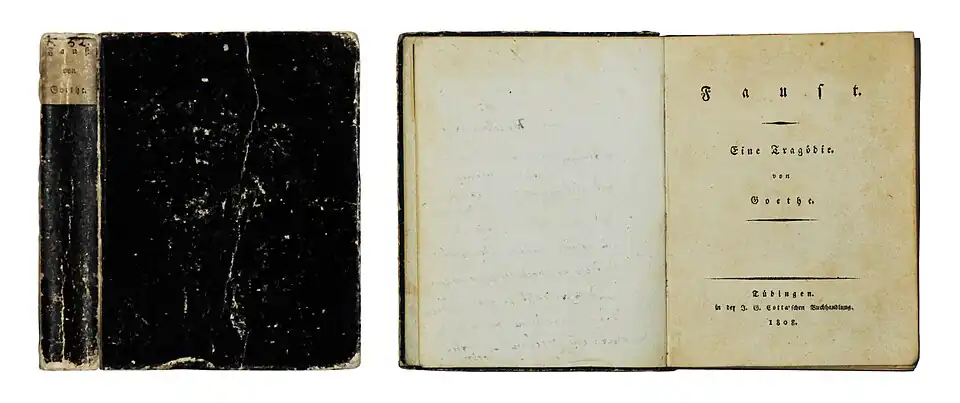 Goethe, J. W.: Faust. Eine Tragödie. Tübingen: Cotta 1808, 309 S., Erstdruck. Pappband der Zeit (Sedez-Format) mit Rückenschild.
