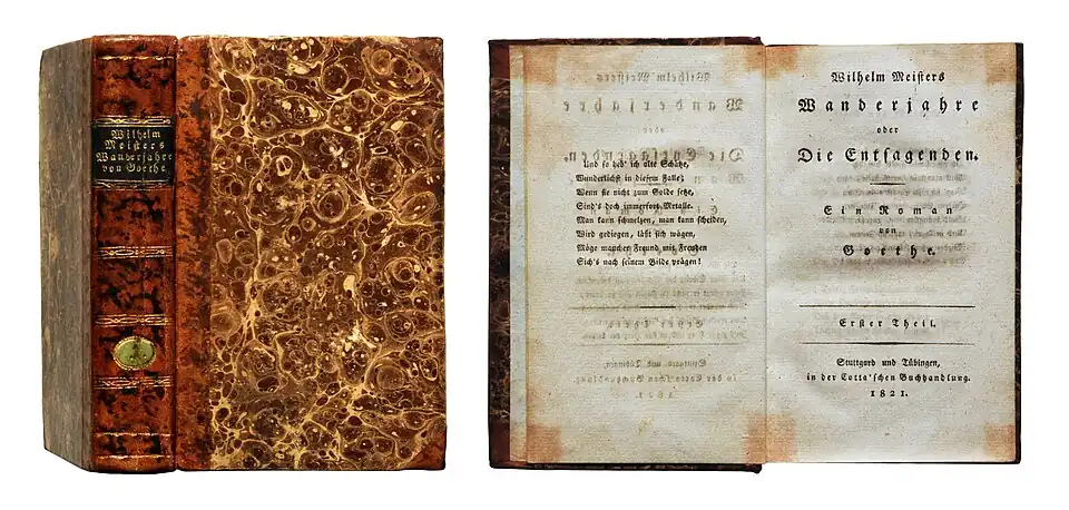 Goethe, J. W.: Wilhelm Meisters Wanderjahre oder die Entsagenden. Ein Roman. Stuttgard und Tübingen: Cotta 1821. Erstausgabe. Halb-Leder d.Zt., Klein-Oktav. Vorsätze leimschattig.