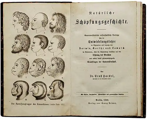 Gemeinverständliche wissenschaftliche Vorträge über die Entwicklungslehre im Allgemeinen und diejenige von Darwin, Goethe und Lamarck im Besonderen, über die Anwendung derselben auf den Ursprung des Menschen und andere damit zusammenhängende Grundfragen der Naturwissenschaft. Berlin: G. Reimer 1868, 568 S., VIII Tafeln, Groß-Oktav, Erstdruck.