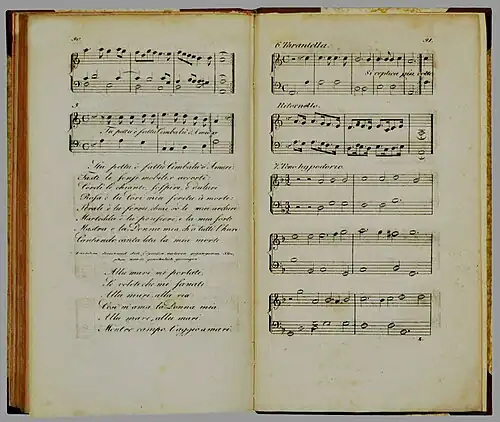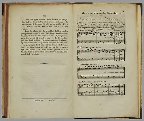 Gestochene Tafeln (S. 89 - 92) mit Notenbeispielen zur Tarantella nach Athanasius Kircher (1654) und Samuel Hafenreffer (1660)