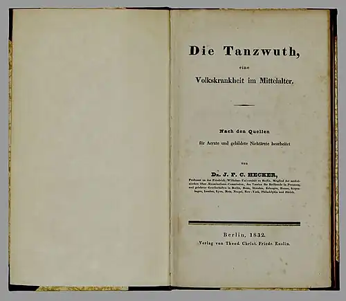 Hecker, J. F. C.: Die Tanzwuth, eine Volkskrankheit im Mittelalter. Nach den Quellen für Aerzte und gebildete Nichtaerzte bearbeitet. Berlin: Enslin 1832, VI S., 92 S.