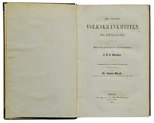 Justus Friedrich Carl Hecker (1795 – 1850) war ab 1834 Professor für Geschichte der Medizin in Berlin. Er gilt als Begründer der „historischen Pathologie“. Als einer der ersten versuchte Hecker die großen Volkskrankheiten aus einer Vielzahl körperlicher, psychischer und sozialer Faktoren zu erklären. Die posthum erschiene Sammlung von Einzelarbeiten, deren Titelblatt hier gezeigt wird, gilt neben seiner „Geschichte der Heilkunde“ (2 Bde. 1822-29) als eines seiner beiden Hauptwerke.