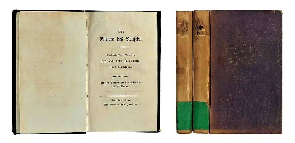 [Hoffmann, E. T. A.:] Die Elixiere des Teufels. Nachgelassene Papiere des Bruders Medardus eines Kapuziners. Herausgegeben von dem Verfasser der Fantasiestücke in Callot´s Manier. Berlin: Duncker und Humblot, Bd. I 1815, Bd. II 1816, Erstausgabe . Pappbände d. Zt., Klein-Oktav.