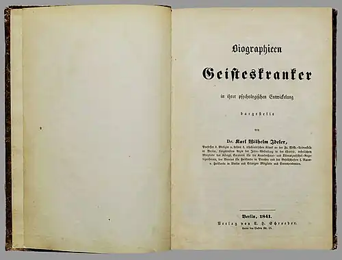 Ideler, Karl Wilhelm: Biographieen Geisteskranker in ihrer psychologischen Entwicklung. Berlin: H. Schroeder 1841, XVI + 222 Seiten + 10 lithographische Tafeln + 1 gefaltete lithographische Tafel, Erstdruck.