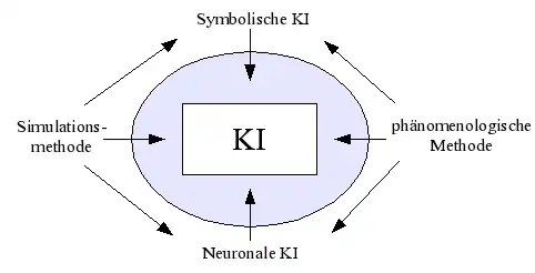Die Neuronale KI verfolgt einen Bottom-up-Ansatz und möchte das menschliche Gehirn möglichst präzise nachbilden. Die symbolische KI verfolgt umgekehrt einen Top-down-Ansatz und nähert sich den Intelligenzleistungen von einer begrifflichen Ebene her. Die Simulationsmethode orientiert sich so nah wie möglich an den tatsächlichen kognitiven Prozessen des Menschen. Dagegen kommt es dem phänomenologischen Ansatz nur auf das Ergebnis an.