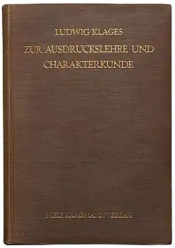 Klages, Ludwig: Zur Ausdruckslehre und Charakterkunde. Gesammelte Abhandlungen. Heidelberg: N. Kampmann 1926, 388 Seiten + 1 Blatt Nachwort + 6 nicht paginierte Seiten Verlagsanzeigen, Erstausgabe.