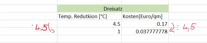- Aus diesen Werten wurde mit Hilfe des Dreisatzes nun bestimmt, was für Maximal und Minimal Kosten sich für jede Maßnahme ergeben, um die Temperatur um 1 °C pro Quadratmeter zu reduzieren