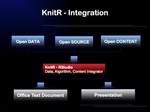 - (Ausgabeformate) Die Erstellung von Textverarbeitungsdokumenten ODT, DOCX, ... , PDF, Präsentationen in LaTeX, Beamer, RevealJS, DZSlides, ... mit Echtzeit-Einbettung von Daten und Diagrammen auf Basis von statistischen und numerischen Analysen wird mit KnitR in unterschiedlichen Ausgabeformaten ermöglicht. Die interne Verwendung von PanDoc erlaubt viele weitere Ausgabeformate.