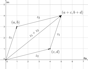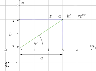 Komplexe Zahlen können in der Form dargestellt werden, wobei jeweils reelle Zahlen sind und die imaginäre Einheit ist. Durch die Identifikation mit einem Vektor kann man komplexe Zahlen in einem Koordinatensystem (Gaußsche Zahlenebene) darstellen.