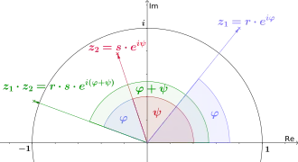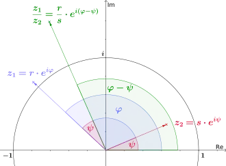 Bei der Multiplikation werden die Beträge und miteinander multipliziert und die zugehörigen Phasen bzw. addiert. Bei der Division wird der Betrag des Dividenden durch den Betrag des Divisors geteilt und die Phase des Divisors von der Phase des Dividenden subtrahiert. Für die Addition und die Subtraktion existiert auch eine, etwas kompliziertere, Formel: