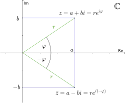 In der Polardarstellung hat die konjugiert komplexe Zahl einen unveränderten Abstand zum Koordinatenursprung (also ) und besitzt gerade den negativen Winkel von . Man kann die Konjugation in der komplexen Zahlenebene also als die Spiegelung an der reellen Achse interpretieren. Insbesondere werden unter der Konjugation genau die reellen Zahlen auf sich selbst abgebildet.