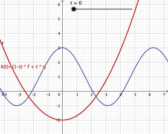 - (Konvexkombination von Funktionen) Wählen Sie und stellen die Konvexkombination von und in Geogebra mit einem Schieberegler (analog zur GIF-Animation), wobei und ist. Was beobachten Sie, wenn Sie den Schieberegler von 0 auf 1 bewegen? ist beschränkt und ist unbeschränkt auf . Welche Eigenschaft hat für ?