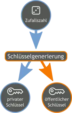 - Der Schlüsselerzeugungsalgorithmus erzeugt ein Schlüsselpaar, das aus einem öffentlichen und dem dazugehörigen geheimen Schlüssel besteht