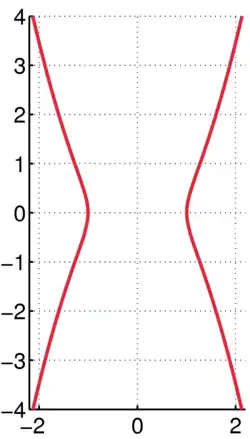 Im Bild 7 vom Anfang und oben sieht man ebenfalls Nullstellengebilde der Form , wobei ein Polynom vom Grad drei ist. Wie sieht aus, damit sich solch eine Kurve ergibt? Die zuletzt genannten Beispiele zeigen auch, dass es von der genauen Gestalt von abhängt, ob die Kurve eine Singularität besitzt oder nicht.