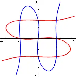 Die folgenden Bilder zeigen einige nicht irreduzible affin-algebraische Teilmengen. Was sind dabei die irreduziblen Komponenten (siehe unten)?