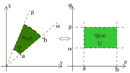 mit und mit wählen. Das Bild davon, also , ist der Schnitt des (offenen) Kreisringes zu den Radien und und dem (offenen) Kreissektor, der durch die beiden Winkel und begrenzt ist.