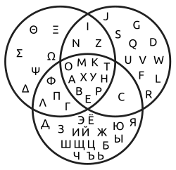 Es sei die Menge der Großbuchstaben des lateinischen Alphabets, die Menge der Großbuchstaben des griechischen Alphabets und die Menge der Großbuchstaben des russischen Alphabets. Bestimme die folgenden Mengen.