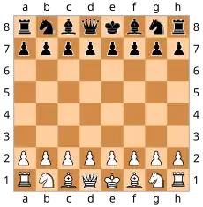 Jedes Feld ist ein Paar, beispielsweise . Da die beteiligten Mengen verschieden sind, kann man statt der Paarschreibweise einfach schreiben. Diese Notation ist der Ausgangspunkt für die Beschreibung von Stellungen und von ganzen Partien.