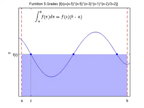 als die Durchschnittshöhe der Funktion ansehen, da dieser Wert mit der Länge des Grundintervalls multipliziert den Flächeninhalt unterhalb des Graphen zu ergibt. Der Mittelwertsatz der Integralrechnung besagt, dass für eine stetige Funktion dieser Durchschnittswert (oder Mittelwert) von der Funktion auch angenommen wird.
