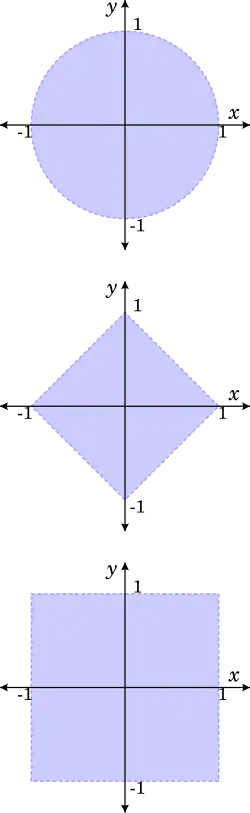 Natürlich müssen Kugeln nicht unbedingt kugelförmig aussehen, aber sie tun es in der euklidischen Norm. Für ist einfach das beidseitig offene Intervall und ist einfach das beidseitig abgeschlossene Intervall .