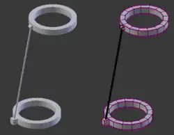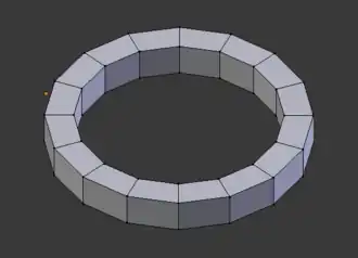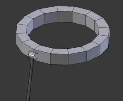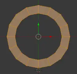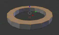 - Wir drücken nun so oft A , bis keine Punkte mehr ausgewählt (orange) sind. Wenden wir nun den "Mean Crease" auf alle Kanten an, die später scharf sein sollen. Beginnen wir bei dem Fuß der Lampe: Wir könnten nun jede der Kanten per Hand (Rechtsklick + Shift) Selektieren, jedoch erleichtert uns Blender bei Kreisen (wem es noch nicht aufgefallen ist: unsere Kanten bilden Kreise) die Selektion erheblich. Um nun so einen Kreis (auch Loop genannt) auszuwählen, halten wir den Mauscourser auf eine Kante des Kreises und drücken Shift+Alt+Rechtsklick.