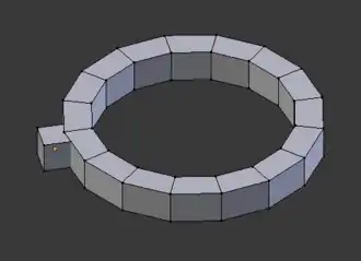 - Nun drücken wir E zum Extrudieren (v. lat.: extrudere = herausziehen) und dann Rechtsklick oder Escape, um die Operation abzubrechen. Dies hat zur Folge, dass wir die Punkte Dupliziert haben, aber auch gleichzeitig die duplizierten Punkte mit den Ursprungspunkten verbunden haben. Was das genau bedeutet sehen wir gleich. (Anmerkung: Der Befehl "Extrudieren" setzt sich aus zwei Operationen zusammen. Zuerst werden die Punkte dupliziert und die Verbindungen erstellt, danach werden die erzeugten Punkte verschoben. Der Rechtsklick (die Escape-Taste) bricht nur die letzte Operation (das Verschieben) ab. Wenn man also den ganzen Befehl rückgängig machen möchte, muss man Strg + Z drücken.)
