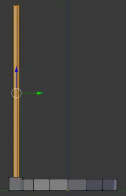 - Wir haben es nun fast geschafft den Fuß der Lampe zu erstellen. Für den finalen Schritt drücken wir nun zwei mal A (1. mal: alles deselektieren, 2. mal alles selektieren), um alles zu selektieren. Es müssten nun alle Punkte orange sein. Nun betätigen wir wieder E zum Extrudieren. Falls eine blaue Achse (Parallel zur z-Achse) angezeigt wird, dann verschiebe die extrudierten Flächen ungefähr so hoch, wie ich es getan habe. Falls die blaue Achse nicht angezeigt wird drücke Z, um die Extrusion auf die z-Achse zu beschränken, d.h. nur die z-Werte der Punkte zu ändern.