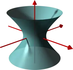 Wir betrachten die Funktion , und dazu die Faser über , also das einschalige Hyperboloid . Der Gradient zu in einem Punkt ist durch und das totale Differential ist entsprechend durch gegeben, daher ist in jedem Punkt von regulär. Der Tangentialraum in einem Punkt ist der Kern des totalen Differentials, eine Basis ist (bei muss man den zweiten Vektor durch ersetzen). Das Einheitsnormalenfeld ist