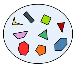 Es sei eine Menge von geometrischen Objekten, beispielsweise eine Menge von -Ecken, gegeben, die sortiert werden sollen. Die Sortierung soll vollständig sein und jedem Objekt genau einen Typ zuweisen. Objekte, die den gleichen Typ repräsentieren, heißen äquivalent (im Sinne der Sortierung). Dafür gibt es verschiedene Möglichkeiten, die mehr oder weniger natürlich sind. Eine naheliegende Möglichkeit bei den -Ecken ist es, sie nach der Anzahl der Ecken zu sortieren. Zwei Objekte sind genau dann äquivalent, wenn sie die gleiche Anzahl an Ecken besitzen. Man kann sie aber auch nach der Farbe oder gemäß der Person, die die Figur gemalt hat, oder nach dem Flächeninhalt sortieren.