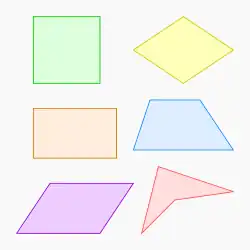 Oder man kann eine Menge von gegebenen Vierecken gemäß gewisser (geometrisch relevanter) Eigenschaften sortieren. Wenn man sich nur auf eine Eigenschaft konzentriert, beispielsweise, ob ein Viereck ein Rechteck ist oder nicht, so gibt es nur zwei Typen bzw. Klassen. Man kann natürlich auch eine feinere Einteilung vornehmen. Man beachte dabei allerdings, dass die mathematischen Begriffe inklusiv sind (ein Quadrat ist insbesondere ein Rechteck), eine vollständige Aufteilung ergibt sich also nur dann, wenn man Konzepte wie Quadrat, Rechteck, aber kein Quadrat, Parallelogramm, aber kein Rechteck, etc. verwendet. Es gibt keine natürliche optimale Aufteilung der Menge aller Vierecke. Ein typisches Phänomen bei solchen Klassifikationen ist, dass es einen großen Rest von Objekten gibt, der außerhalb jedes Regularitätskonzeptes liegt.