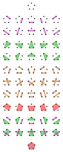 eine disjunkte Vereinigung von nichtleeren Teilmengen, die auch die Blöcke der Partition heißen. Da eine Partition als Teilmenge der Potenzmenge angesetzt wird, sind zwei Partitionen genau dann gleich, wenn sie die gleichen Blöcke enthalten. Die Blöcke sind nicht geordnet oder nummeriert. Als Extremfälle gibt es die Partition in einen einzigen Block, der alle Elemente enthält (die Klumpenpartition) und die Partition, bei der jeder Block einelementig ist. Wir werden hier Partitionen von endlichen Mengen in den Mittelpunkt stellen. Typischerweise werden wir eine Mengen mit Elementen in Blöcke aufteilen. Jeder Block hat dann eine gewisse Anzahl, und man kann diese Situation kombinatorisch studieren. Dabei ist eine Partition stets von ihrem numerischen Typ zu unterscheiden. Wenn beispielsweise eine fünfelementige Menge in zwei Blöcke mit zwei bzw. drei Elementen eingeteilt wird, so stehen dahinter zehn verschiedene Partitionen. Es ist aber sinnvoll, sich alle Partitionen entlang solcher numerischer Überlegungen zu vergegenwärtigen.