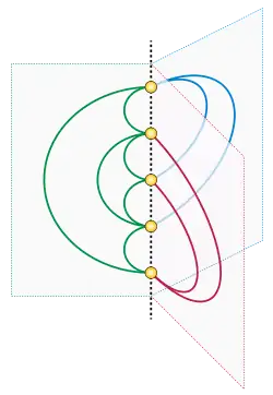 Der Punkt wird durch gerade (ziemlich vertikale) Strecken mit seinen Liftungspunkten verbunden. Diese Verbindungsstrecken liegen allesamt im Schlauch . Zu jedem Punktepaar gehört eine Ebene , . Die Punkte und werden nun dadurch miteinander verbunden, dass man von aus entlang und von aus entlang jeweils bis zum Durchstoßungspunkt mit der -Ebene hochgeht. Die beiden Durchstoßungspunkte werden dann horizontal in der -Ebene durch eine gerade Strecke verbunden. In dieser Konstruktion werden alle Punkte miteinander überschneidungsfrei verbunden, da die Verbindungswege nur in den Schläuchen und in den verschiedenen Ebenen verlaufen.