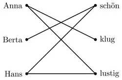 - (Anna, klug), (Hans, schön), (Berta, schön), (Hans, lustig), (Anna, lustig)