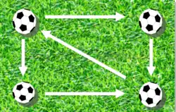 Eine (Fußball-)Spielgruppe bei einer Europa- oder Weltmeisterschaft besteht aus vier Mannschaften, und jede spielt gegen jede. Ein Spiel kann unentschieden oder mit einem Sieg für eine der beiden Mannschaften enden. Wir interessieren uns für die Gewinnrelation in einer Spielgruppe, die man durch einen gerichteten Graphen beschreiben kann, wobei man einen Sieg von über durch einen Pfeil von nach (und ein Unentschieden durch keine Verbindung) ausdrücken kann.