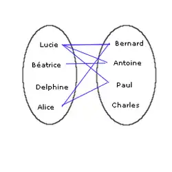 Eine weitere Möglichkeit besteht darin, die Information durch ein Verbindungsdiagramm auszudrücken, bei dem Person und Eigenschaft genau dann durch eine Strecke oder eine Kurve verbunden werden, wenn die Eigenschaft zutrifft.