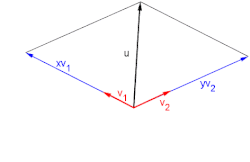 Der von der leeren Menge erzeugte Unterraum ist der Nullraum.[4] Dieser wird ebenso von der erzeugt. Zu einem einzigen Vektor besteht der aufgespannte Raum aus . Bei ist dies eine Gerade, was wir im Rahmen der Dimensionstheorie noch präzisieren werden. Bei zwei Vektoren und hängt die „Gestalt“ des aufgespannten Raumes davon ab, wie die beiden Vektoren sich zueinander verhalten. Wenn sie beide auf einer Geraden liegen, d.h. wenn gilt, so ist überflüssig und der von den beiden Vektoren erzeugte Unterraum stimmt mit dem von erzeugten Unterraum überein. Wenn dies nicht der Fall ist (und und nicht sind), so erzeugen die beiden Vektoren eine „Ebene“.