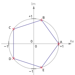 Der fünfte Kreisteilungskörper wird von der komplexen Zahl erzeugt. Er hat aufgrund von Lemma 27.12 die Gestalt