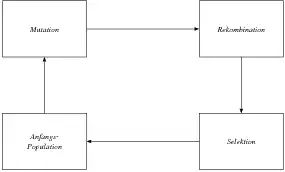 Das Problem des Nichtgefressenwerdens wird durch einen fortdauernden Zyklus von Mutation, Rekombination und Selektion optimiert (vgl.~Abbildung~\ref{fig:schema}). Dies ist auch das generelle Schema und die Basis der genetischen Algorithmen.