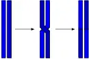 | Bei der Rekombination werden beide Kopien der DNS an der gleichen Stelle durchtrennt und vertauscht wieder zusammengefügt. |