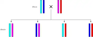 | Beide Eltern tragen je zwei Kopien ihres Erbgutes. Bei der Paarung werden dem Spross je eine der Kopien beider Elternteile gegeben. Es sind also 4 verschiedene Kombinationen möglich. |
