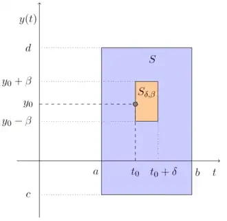 Wir betrachten die Anfangswertaufgabe (1.6) einfachheitshalber als skalare Gleichung, d.h. und . Die Verallgemeinerung des Beweises einer Lösung für Systeme (1.7) ist möglich und wird später erläutert.