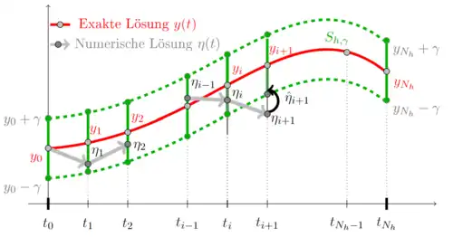 In jedem Schritt des numerischen Verfahrens wird eine Annäherung der Lösung an entsprechender Stelle gewonnen und für weitere Schritte benutzt. Am Anfang () nimmt man noch den exakten Startwert und gewinnt im ersten Schritt des ESV eine numerische Lösung in , wobei . Diese nutzt man in nächstem Schritt um auszurechnen, allerdings ist in diesem (zweiten) Schritt bereits der Startwert fehlerbehaftet, da in . So wird die tatsächtlich erzeugte numerische Lösung ab dem zweitem Schritt nicht mehr mit der numerischen Lösung (ausgehend aus exaktem Startwert, siehe Bemerkung 3.1 Punkt ii), übereinstimmen. Außer dem lokalen Diskretisierungsfehler gehen auch die fehlerbehafteten Startwerte in die numerische Schrittberechnung ein, also eine weitere Ungenauigkeit. In jedem Berechnungsschritt kummuliert sich der Fehler zum globalen Diskretisierungsfehler . Dieser weicht damit von dem lokalen Fehler für ab. Ein konvergentes Einschrittverfahren weist sich allerdings mit einem angemessen kleinen globalen Diskretisierungsfehler aus, der für Schrittweite verschwindet. Das Akkumlieren des Fehlers, der lokale Verfahrensfehler und der globale Diskretisierungsfehler ist in folgender Grafik dargestellt.
