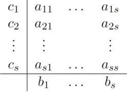 Sei die Anzahl von Stufen/Stützstellen, die Koeffizientenmatrix mit Einträgen , sei Vektor der Gewichte und Vektor der Stützstellen.