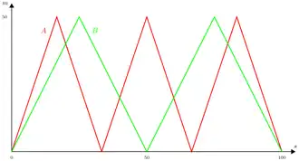 - Erstelle in einem Diagramm für beide Schwimmer den Graphen der jeweiligen Abbildung, die für die Zeit zwischen und Sekunden angibt, wie weit der Schwimmer von der Startlinie zu diesem Zeitpunkt (wirklich, also unter Berücksichtigung der Wenden) entfernt ist.