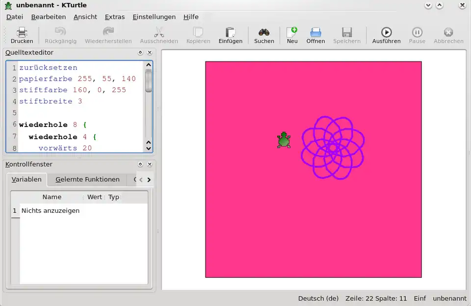 Preview auf die KDE 4.0-VersionNeue Version: Es ist wohl bald mit einer verbesserten Version zu rechnen, die an KDE 4.0 angepasst sein wird. Damit wird sich auch die Programm-Optik ändern. Die bisherigen Screenshots wären dann nach Möglichkeit durch neuere zu ersetzen. Nachteilig für die Code-Rubrik: "A lot of things will change in this upcoming version of KTurtle. For instance the syntax of the KTurtle programming language will change: most old programs will not run."