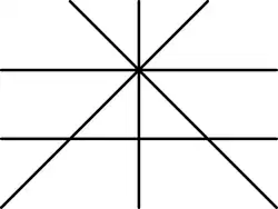 Skizziere möglichst viele wesentlich verschiedene Konfigurationen von fünf Geraden in der Ebene, die sich insgesamt in vier Schnittpunkten treffen.
