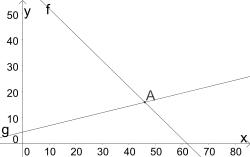 Die Aufgabe lässt sich auch geometrisch lösen, indem die beiden Zeilen des linearen Gleichungssystems als Geradengleichungen interpretiert werden. Dabei werden die Variable als und die Variable als bezeichnet und beide Gleichungen nach aufgelöst: